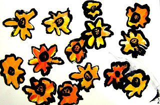 I saw this idea on one of my favorite blogs, Art Project Girl, and had so much fun doing it with my Kindergarten classes! Here is a link to Art Project Girl's post: Easy Project You Can Do Tomorrow. The kinders loved making their bright flowers as they practiced double loading their paintbrushes with red and yellow paint to make different orange hues. They also practiced thick lines, thin lines and outlining.